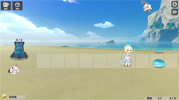 2.点击或拖拽屏幕上方的卡片来放置角色,点击或拖拽卡片栏右侧的派蒙图标可以让角色撤退。屏幕左上角显示原石数量,左下角显示摩拉数量,右下角显示当前关卡和波次。