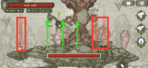 如图,地图上会出现类似红框内的红色光柱,这就表示boss要召唤地刺了,但是地刺召唤好像是无序的,所以偶建议大家向上跳跃(绿色剪头方向),时间自己多试试把握哦(为了截图死了几次就没有细测,偷个懒),不过如果在地面上有boss召唤残留的石块时,我们也可以站在上面躲避(建议还是进行跳跃)