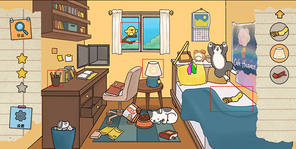 4、拉开窗帘可以找到小鸟,往下拖动杯子可找到袜子,点击床边的点灯开灯就有了发光的台灯,往上拖动椅子上的书本,将其挪到可以找到草莓绳子。