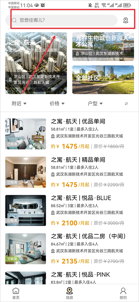 1、打开之寓app,在找房界面中用户可以自己搜索居住的位置的名称,搜索后系统会为你推荐该位置内合适的房源