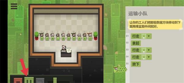 2、根据要求我们可以发现需要员工向下行走一步,然后拿起再向前走两步放下,然后就可以将相关的指令放入到右边空白处,注意顺序不要搞错了。