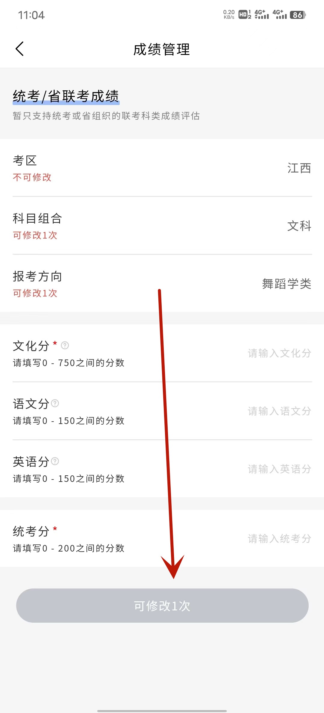 4、填写相应文化分、语文分、英文分、统考分,点击“可修改一次”提交信息,就完成了信息填写。