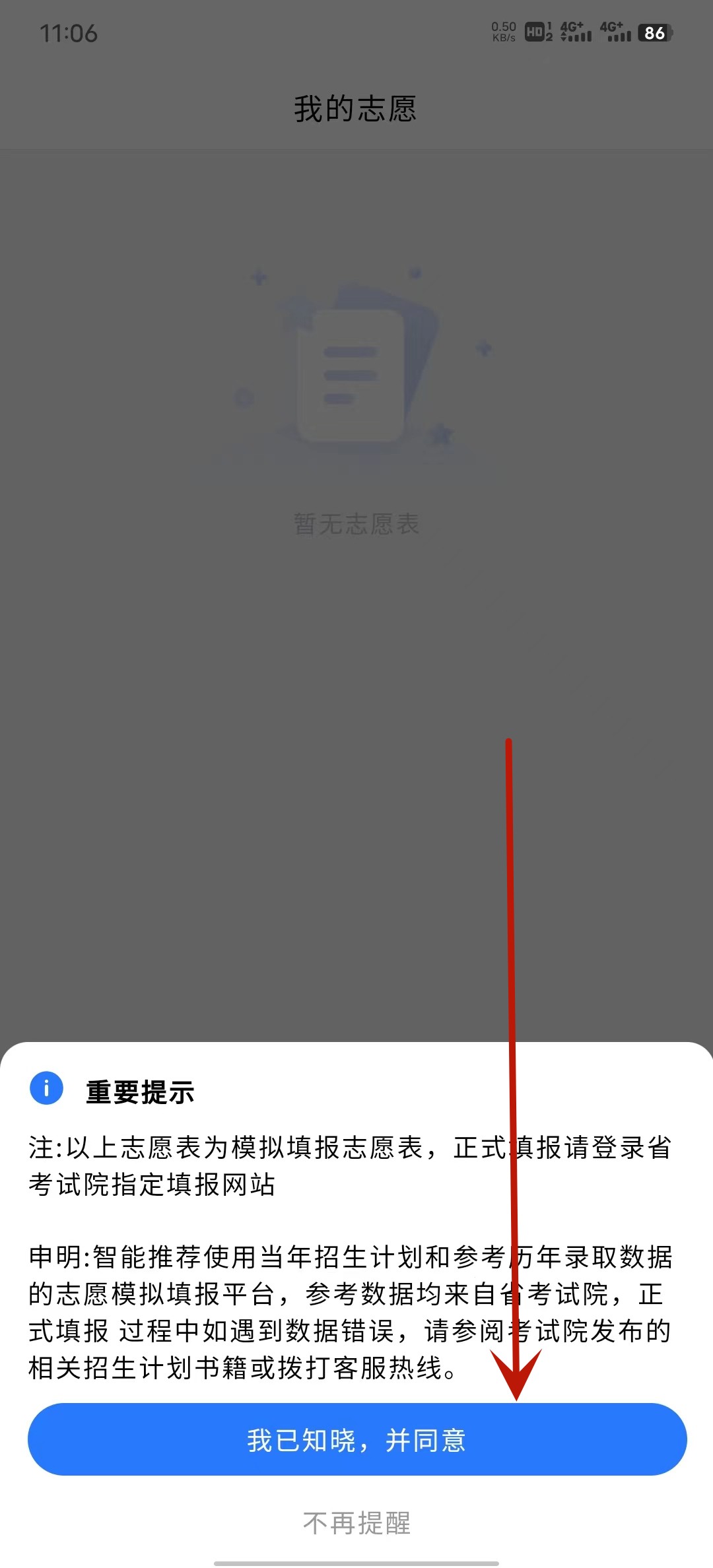 6、点击“我已知晓,并同意”,就可以开始模拟志愿填写了。