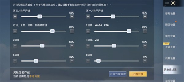 4、陀螺仪灵敏度:第三人称不开镜:163%;第一人称不开镜:168%;红点、全息、机瞄、侧面瞄准镜:241%;2倍镜、win94、p90、猎弓:152%;3倍镜:155%;4倍镜、vss:121%;6倍镜:49%;8倍镜:39%
