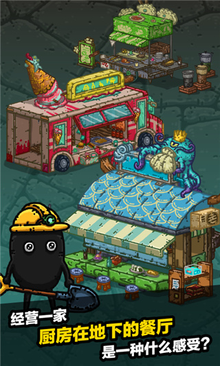 黑暗料理王是一款模拟经营类游戏,游戏背景是玩家经营着一家黑暗料理店,你将探索神秘的地底世界,这里有各种奇怪动物,抓捕他们并让神秘雇员小黑人去饲养、收割这些神奇的怪兽,获取料理食材。这款游戏以新奇的游戏设定以及有趣的冒险玩法为大众喜爱,玩家需要驾驶货车在地图上躲避怪物,抓捕料理动物,此外,在饲养笼中可以看到各类搞怪魔性的收集画面,是一款富有创新力的游戏。
