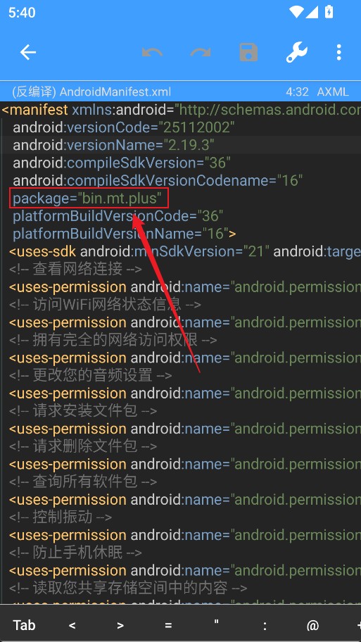 9、文件反编译完成后,找到package字段,后面显示的即为原包名,将其修改为你需要的新包名。