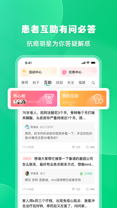 新增互助板块,归集病友间真实互助问答,解答康复困惑,寻找医疗资源。