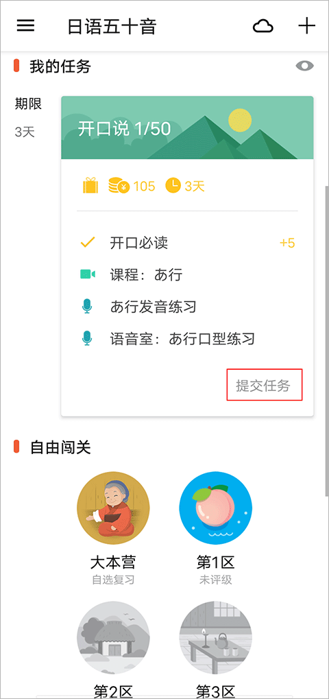 1、最最日语app可以帮助用户随时随地轻松学习日语,但发现很多小伙伴在添加任务后不知道怎么取消任务,想知道的赶快来看看下面的教程吧!小编依次为大家演示添加与取消任务的方法,用户只需点击右上角的“+”号选项,即可添加任务。