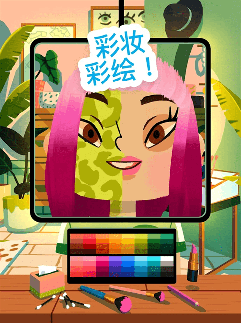 游戏玩法自由性很大的,我们随意的选择喜欢的进行试玩,游戏中的人物还会撒娇这个也是比较有趣的。 要化妆的话直接点击桌面上的道具,找到眼影盘就可以化妆了。