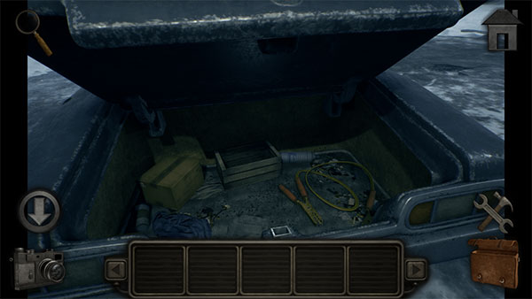 6、到大厅处点击左边的车厢,然后根据办公室看到的两个提示完成上面的机关锁,接着进入车厢拿走里面的梯子和胶靴。