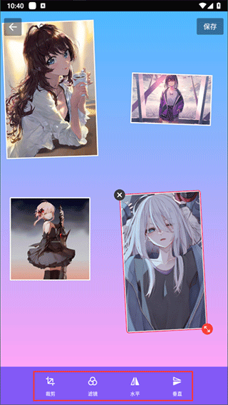 4.然后我们就可以自由移动每一个图片的位置了,如果想要编辑图片,也可以单击图片,为其【裁剪】、添加【滤镜】、【水平】或者【垂直】反转等等;