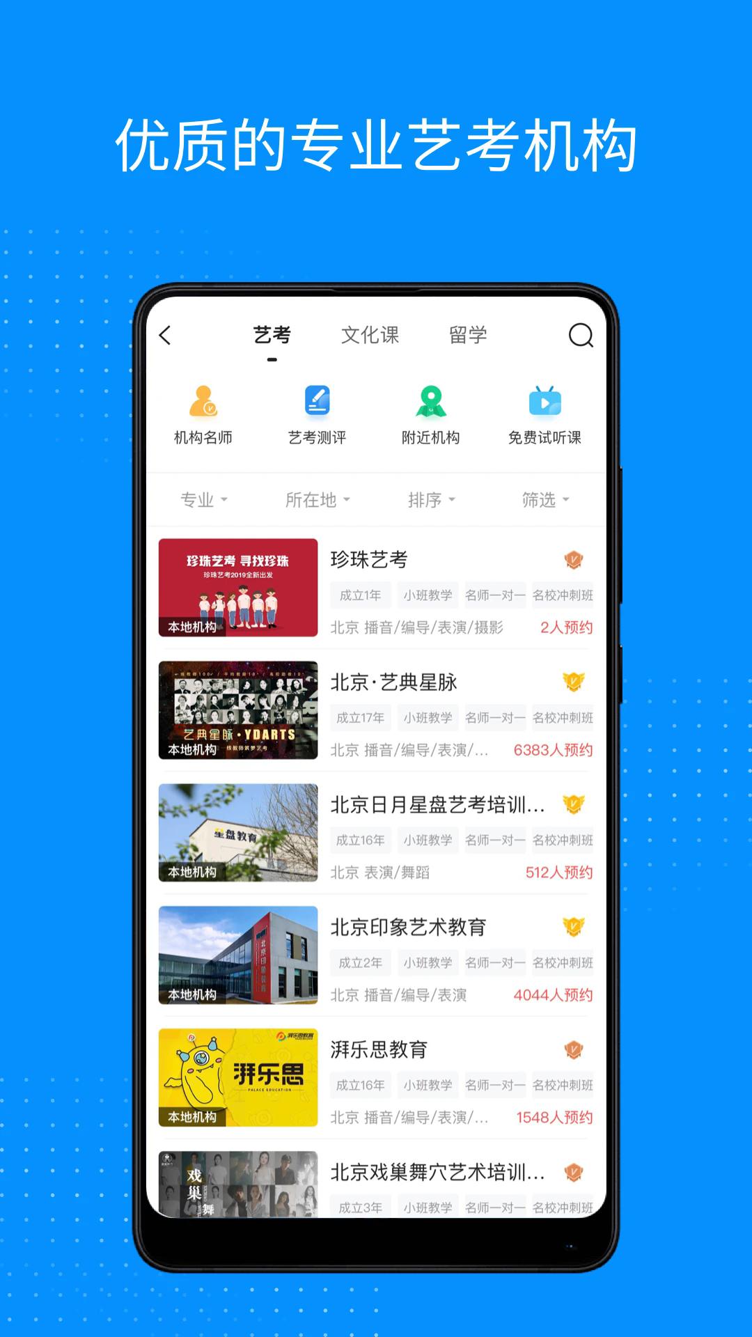 -专业强:汇聚全国各地优质艺考培训机构,师资来自顶尖艺术院校,他们会根据你的个人特色定制专业课程,帮你提升专业水平,助你实现艺考梦!