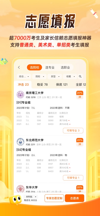 掌上高考App是由中教智网(北京)信息技术有限公司推出的一款高考填志愿软件,软件里关于志愿的信息非常的齐全。轻松全国各地大学的招生计划与招录批次,实时获取最新的志愿填报信息。还可以通过智能筛选,轻松找到适合自己的学校。无论是备考阶段还是志愿填报时期,这款App都能为你提供全面的帮助。