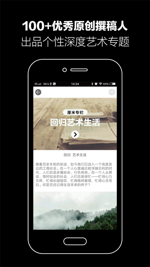 《艺厘米》是一款专为艺术家以及艺术爱好者们打造推出的艺术作品分享以及交易类应用软件。通过这款软件,用户们不仅能欣赏到出自各位名家之手、拥有各种不同艺术风格的画作,包括水墨、油画、雕塑、版画、绘画、综合材料、影像、装置、摄影、书法篆刻、古迹文献等等,能够满足用户们的不同爱好需求。同时,用户还能了解到艺术家和设计师们的不同设计理念,以及全球顶尖艺术机构们所打造的移动私人博物馆。