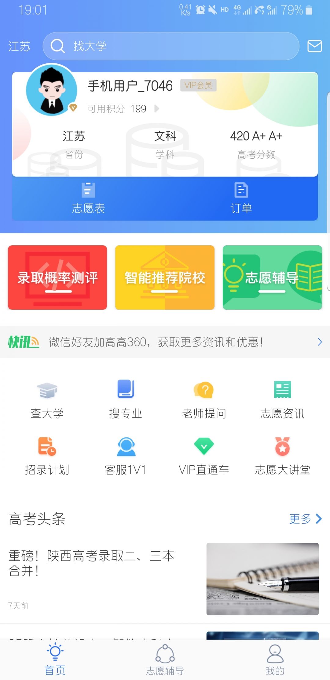 2、进入我的页面,可以点击查看我的订单、我的优惠券、录取概率报告、我的志愿表