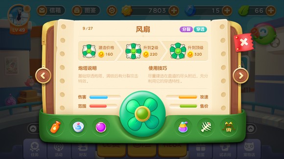 风扇炮塔能够穿透攻击一行的敌人,在二代,风扇改名叫减速风扇并且更换新造型,并且还拥有减速效果;在三代,风扇炮塔不会再有减速效果了并且满级时攻击可以分散多个小风扇,造型继续使用二代造型。