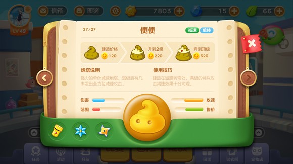 便便炮塔是我们熟知的伙伴,它的味道十分古怪,但是会对怪物造成大幅减速,攻击距离也跟近,伤害也跟低,在二代,便便炮塔换上了一个全新的造型,在三代的游乐园主题中,便便炮塔正式回归,并且继续保留原造型,而且满级后有几率能够对周围目标造成减速。