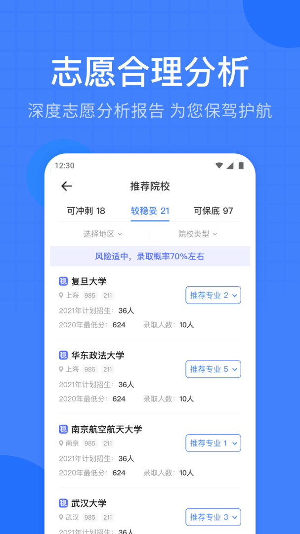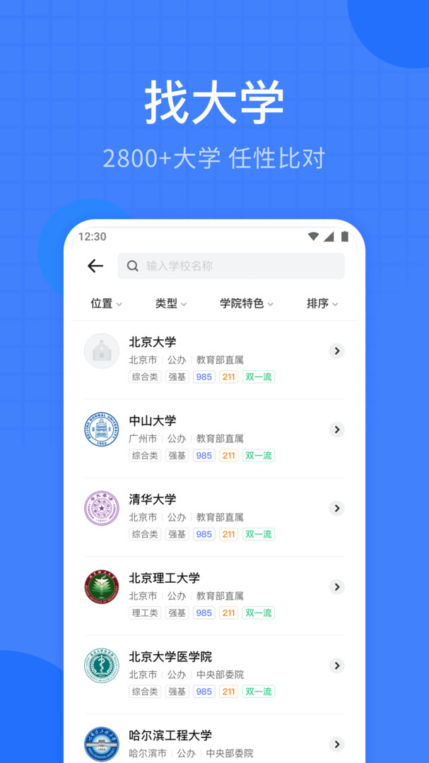 可查询全国3730所院校在不同省份的招生预测分数线和名次线。提供按照省份、学校类型等关键字筛选,随时可以根据自己的目标定位高校,让考生对自己的分数、名次情况一目了然。