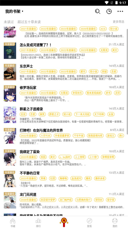 用户可根据点击、月票、新书、收藏、畅销、推荐、刀片、更新、吐槽九个榜单查找自己喜欢的书籍。