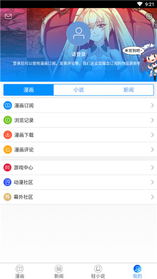 4、点击最后一个模块“我的”,在此可以进行签到和注册登录,以及加入动漫社区。