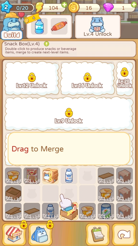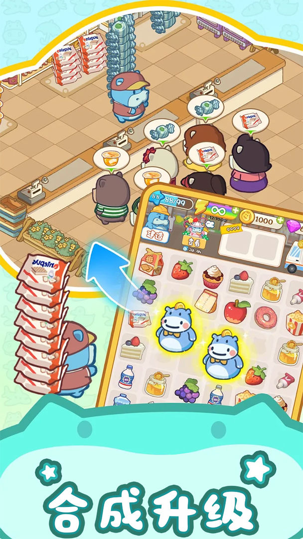 疯狂搬超市是一款模拟经营类合成手游。进入游戏后玩家需要帮助没有经营经验的小河马经营一家超市,刚开始超市里面什么都没有,需要玩家通过合成物品完成顾客的订单收获金币,才能对超市进行建设装修工作。随着后期物品解锁的越来越多,将一步步的扩大超市的规模逐渐成为一家商城。