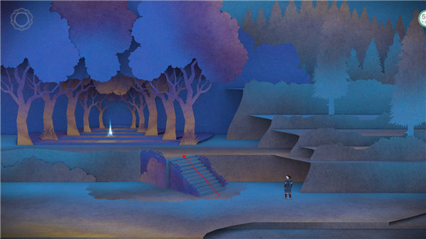 2、双击屏幕后向右边走,我们可以发现下方有河流过不去的。然后我们沿着屏幕的最下方进行滑动便可以拉出风铃,然后狼会趴下。(后面有狼的地方我们先要找到和一样的风铃)随后便会出现一座桥,我们从桥上走过去,来到下一个场景。