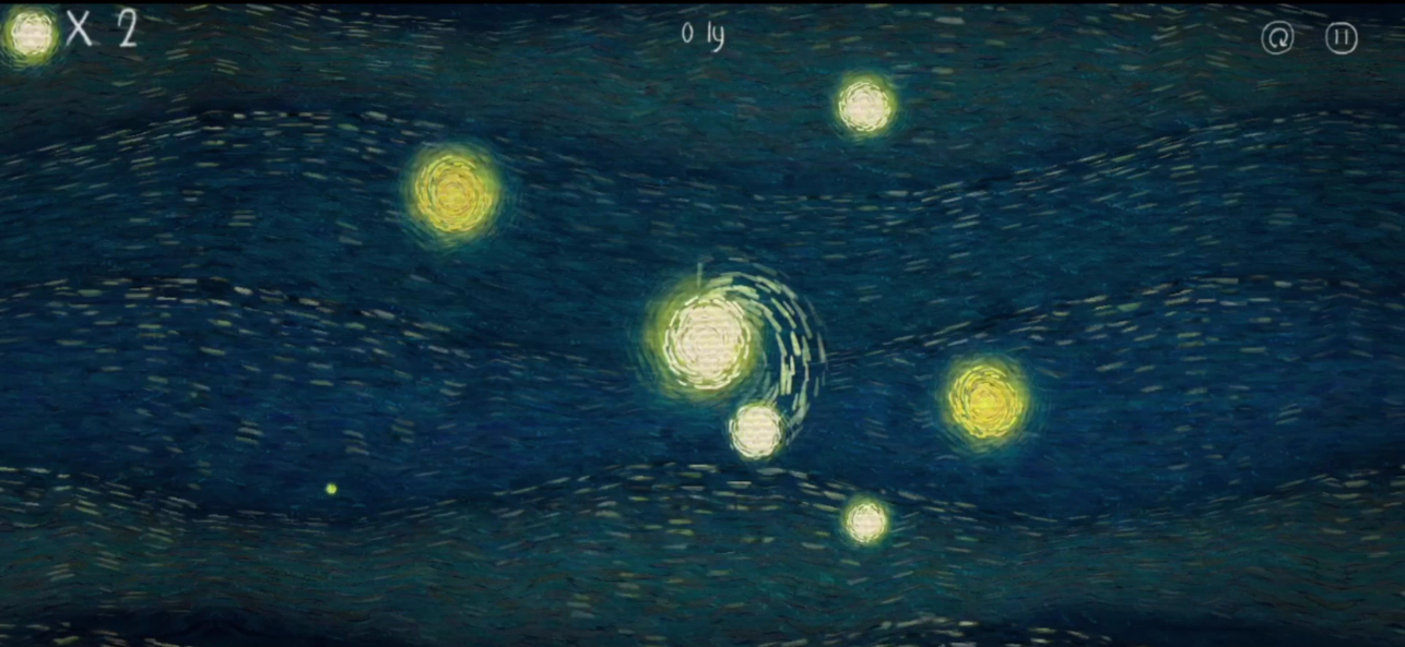 1、以画家梵高的作品星空作为游戏背景,在星星中不断穿梭前进,十分震撼