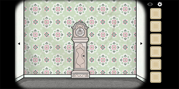 34、晚上的抽屉柜这里,有一只猫头鹰,点击后飞走,立钟上多出一只猫头鹰。同时边上的月亮使用小刀划开后拖动眼睛看向四周,可以看到四个密码,这个密码用在立钟下面的盒子上。34