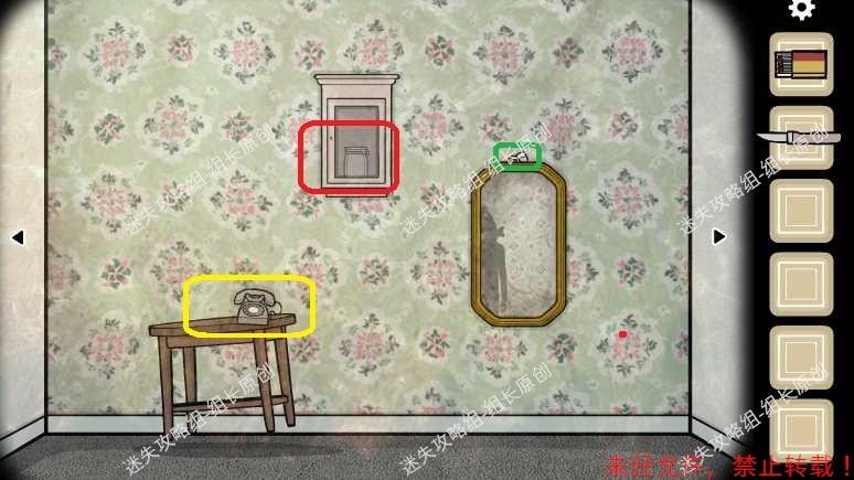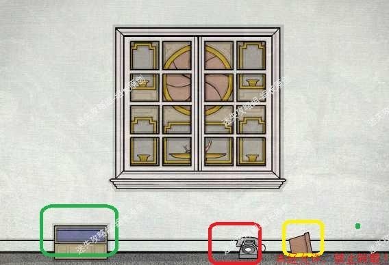 5、下图黄框处点击后使用电话,依照从左到右的顺序点击泡泡,会出现折纸,多次点击到最后可以看到钥匙,钥匙直接对红框处使用就能得到罐子。镜子记得放大看提示,同时可以在绿框处得到一个海螺。5、1