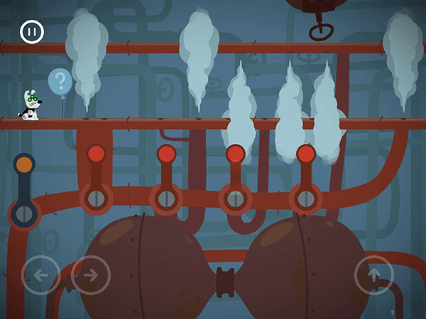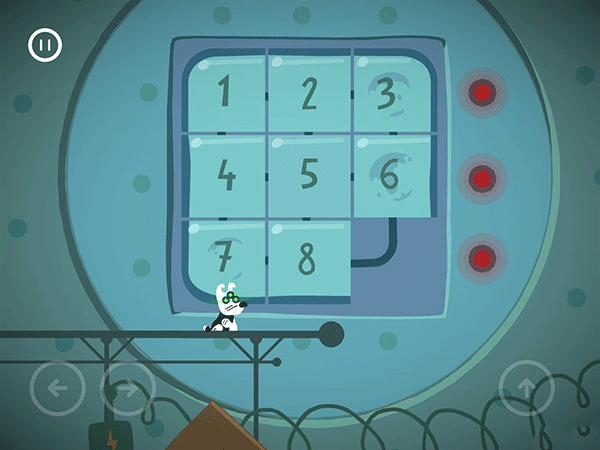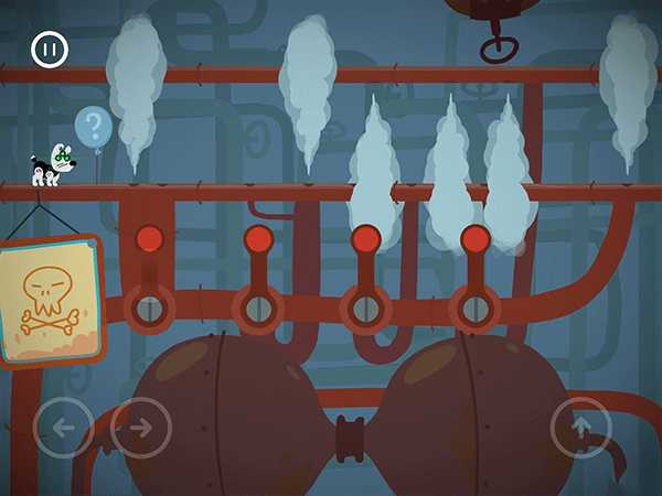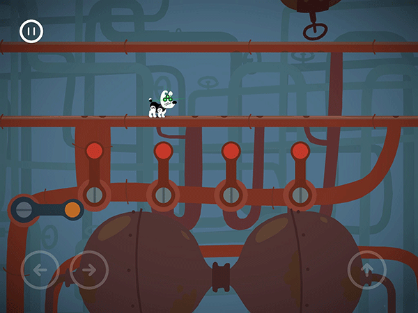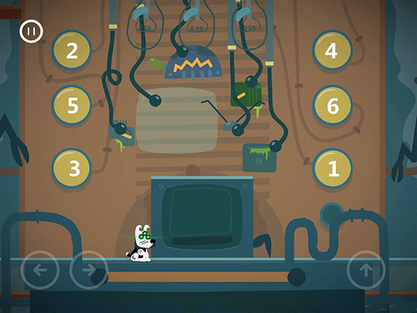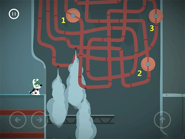 这边按了左边黄色按钮的时候,右边的门就开始计时下落了。这个板要先从右往左把板弄到最低,然后就可以吃完灯泡和骨头过闸门。切记不要慌张。