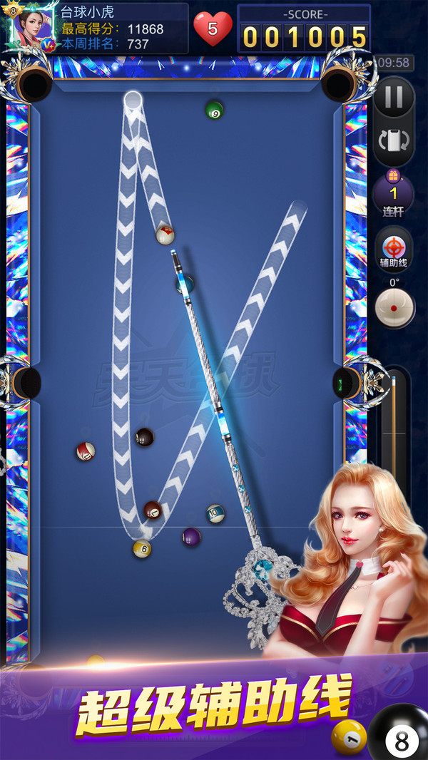 1、左右移动标尺,需要通过控制来移动球杆,点击就能够射出去击打台球了,把目标球计入栏中就可以得到分数。