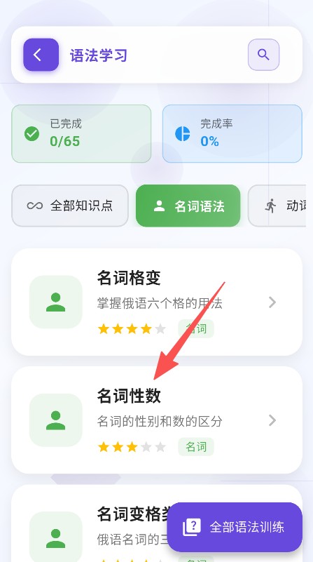 3、展示学习进度数据,如语法学习的完成量与完成率,辅助掌握俄语学习的推进状态。