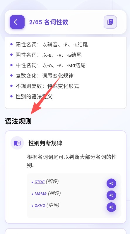 2、语法学习板块拆分具体知识点,支持选择对应内容如名词性数,开展针对性语法学习。
