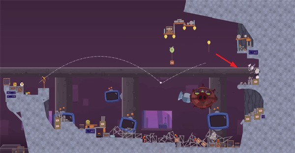 1、进入boss关卡中,首先需要在左侧拉动弹弓,发射白色小鸟,抛物线如图。