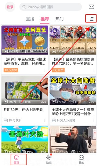 打开客户端首先映入眼帘的自然是「首页」这一标签页。国际版哔哩哔哩客户端相较于常规版本去除了右上角的游戏中心入口和顶部的滚动 Banner。如果你并不是哔哩哔哩服的游戏用户,这一改变可以帮助你减少一处烦人的红点。