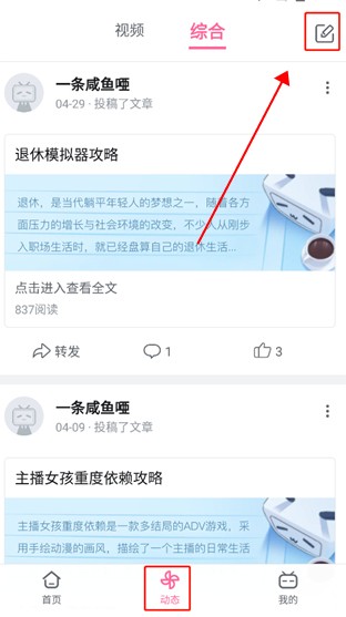 登录软件后,点击动态,选择视频或是综合,点击右上方;