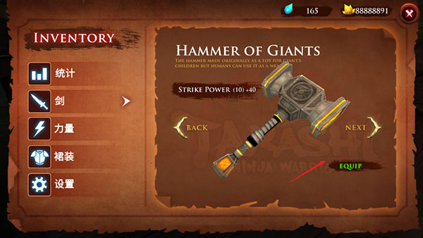 4、点击右上角的暂停菜单后,就可以看到剑、力量、裙装的配饰详细介绍,点击EQUIP你可以换上新的武器与裙装。