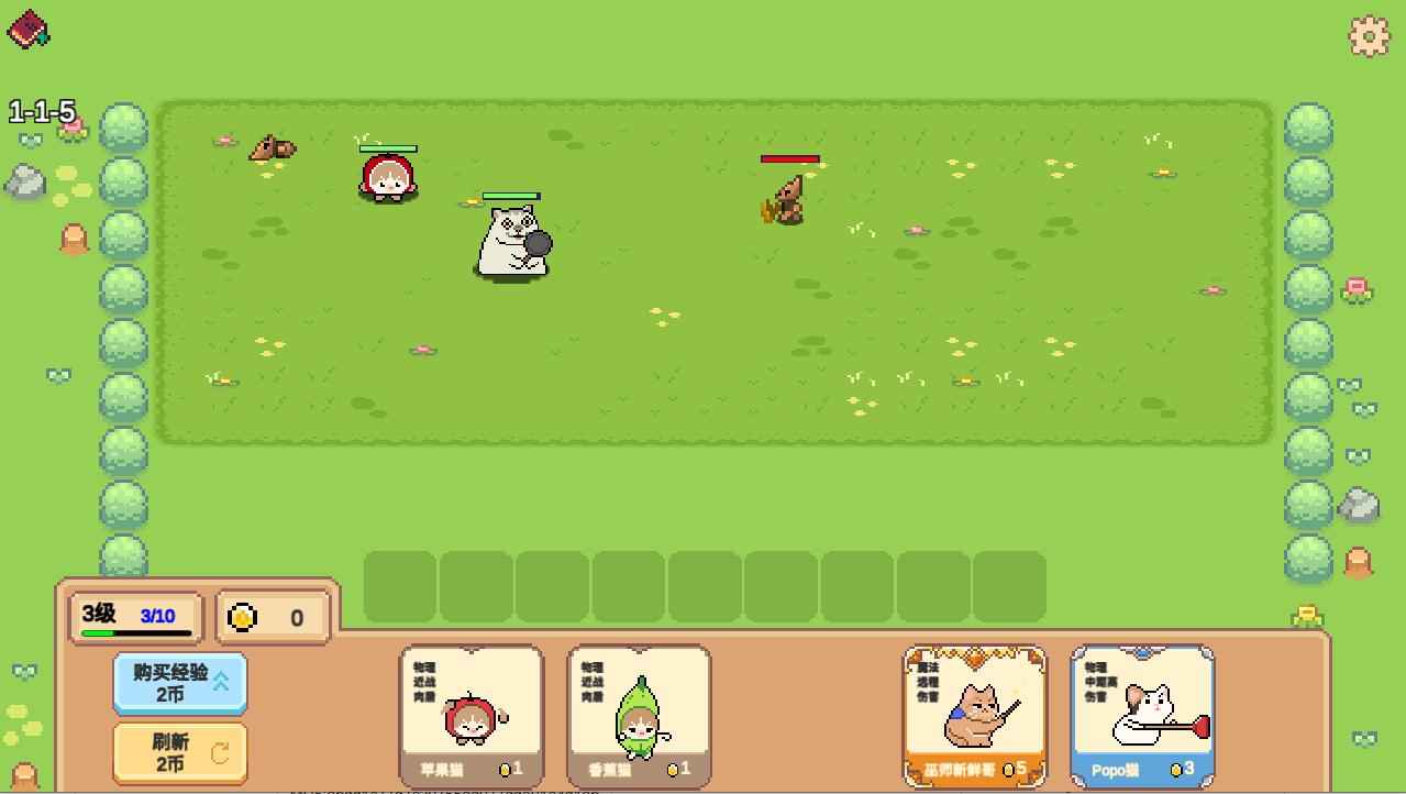 5、击败敌人后会获得金币和经验,金币可以用来升级、刷新和购买新的猫meme角色。