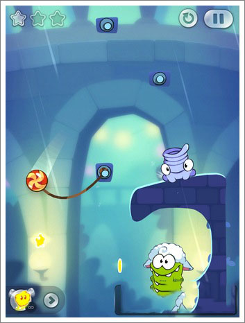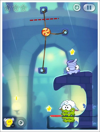 技巧:这一关通过额外任务的只有一个方法,不过运气成分有点高,主要是切割糖果上面和右边绳子的相隔时间,掌握一个时间间隔就能快速掉到下面的石壁(而不被Toss抓到),进行一个反弹,然后收集两颗星星并过关。