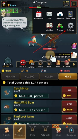 1、刚开始进入游戏的玩家,可以根据图中指示,在右上角的下拉菜单中,找到“Settings”。