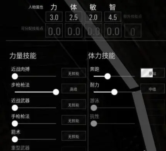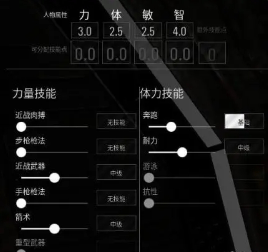 技能点是你上一个界面设置潜力点数的双倍,推荐加点步枪拉满剩下的近战拉满,奔跑拉满,剩下的耐力拉满,潜入拉满,意识暂时不知道影响什么,拉1级,伪装1级,生存1级。剩下的狙击拉满,基本就是这样了。