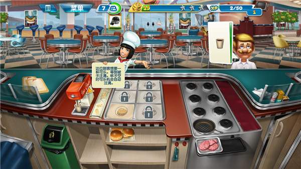 1、打开游戏,进入关卡1。根据客人的口味,选择汉堡包,然后将牛排放入到汉堡包里面,最后将食物递给顾客。顾客吃到自己想要的食物,就会给与金币和小费在桌子上,你需要点击桌子上的货币来获取。