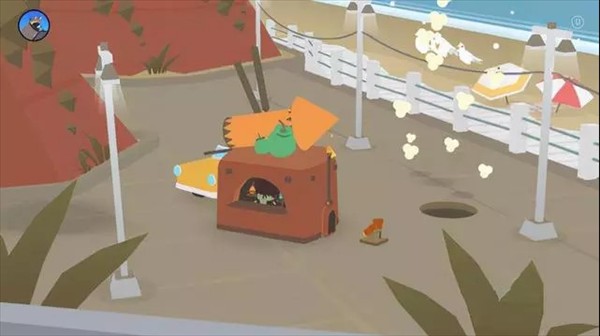 7、大鸟旁边的篮子里装着玉米、还有一个火堆。掉下来以后一起吃掉,地洞就又会爆出很多的爆米花。