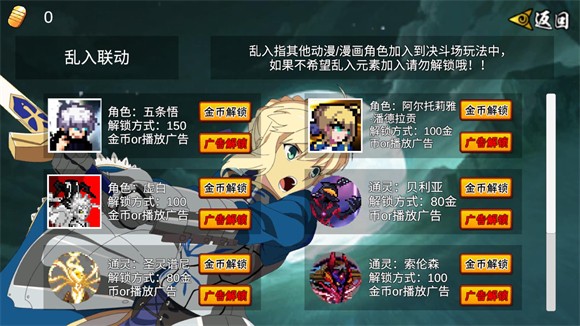 1、五条悟有两种解锁方式,第一种是在乱入界面消耗150金币解锁或者看广告来解锁。