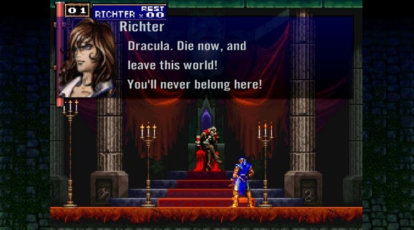 游戏开场就是前作《恶魔城X:血之轮回》的结尾,此时将控制里希特杀入恶魔城最上部的王座之间。与德古拉战斗时若失败,年幼的玛丽亚会即时赶到,并召唤出四圣兽让里希特变成无敌状态,打败德古拉后进入正题。