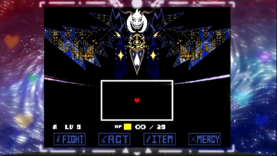 5、敌方攻击是玩家需要操控自己躲避攻击,中间的红心就是玩家,需要躲避边框里出现的各种白色物品。