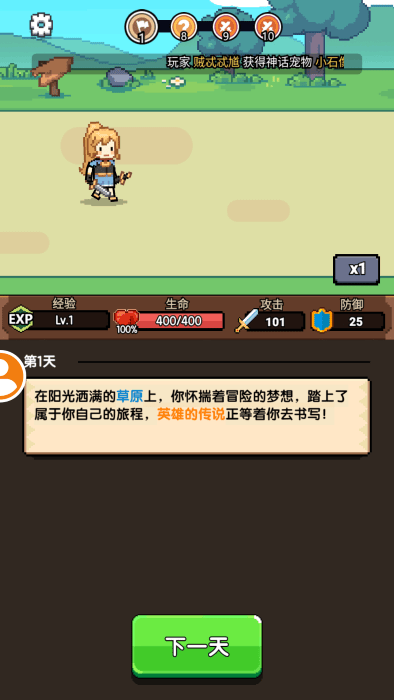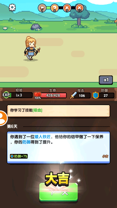 一天又一天的rpg,这是一款非常好玩的休闲冒险rpg手游。游戏采用经典像素风格,你将扮演一位勇敢的冒险者踏上冒险之旅。每天都是全新的挑战,你需要不断地战胜敌人获取装备、选择技能,通过日积月累逐步变强,成为最强冒险者。游戏还提供了副本挑战、宠物系统等趣味玩法,你可以培养宠物作为自己的伙伴,共同挑战副本,让你不再无聊!