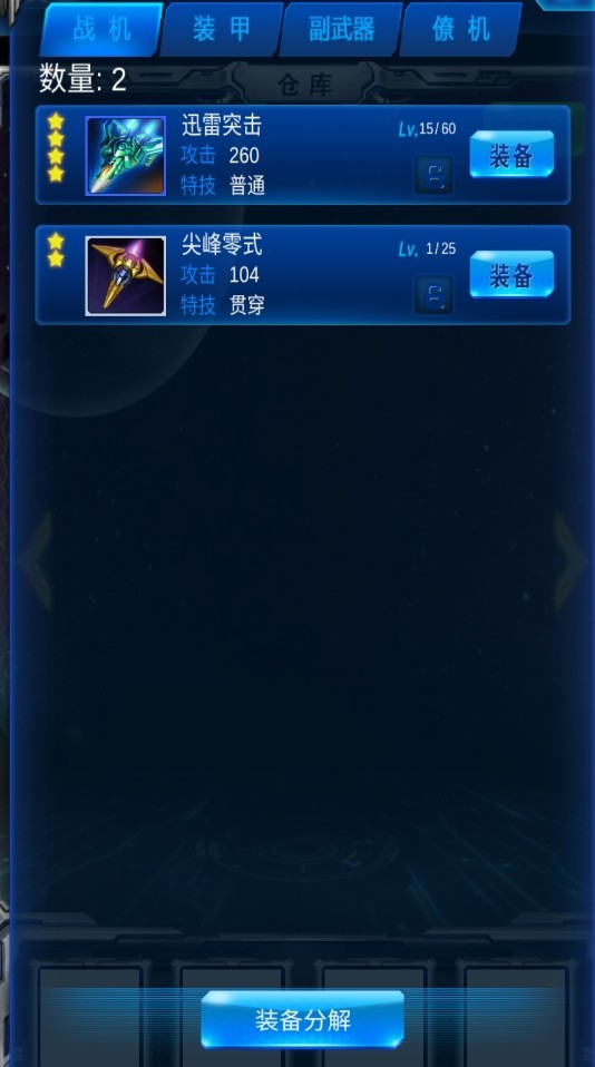 3、点击下方仓库按钮进入装备选择,有战机、装甲、副武器、僚机可以选择,选择好了,就可以愉快的玩耍了!