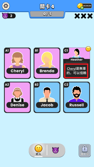 游戏中根据第一个卡牌的人物文字提示来逐渐的找出好人和坏人,每一个人下面都会有文字提示的。
