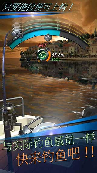 1、往下拖动中间的红色按钮,来向湖中进行抛竿。